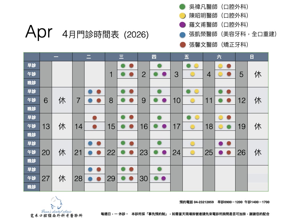 2026-04 門診時間表 一轉眼,2026年已經迎來第四個月份了 四月起,我們將新增一位「口腔外科專科醫師」為大家服務! 為各位隆重介紹 「羅文甫醫師」 學經歷: 1. 中國醫藥大學牙醫碩士 2. 中華民國口腔顎面外科專科醫師 3. 中國醫藥大學牙醫系臨床講師 4. 中國醫藥大學附設醫院兼任主治醫師 寬禾嚴選,口外專科 為大家提供 「專業,親切,安心」的診療服務! 歡迎預約諮詢 立即預約